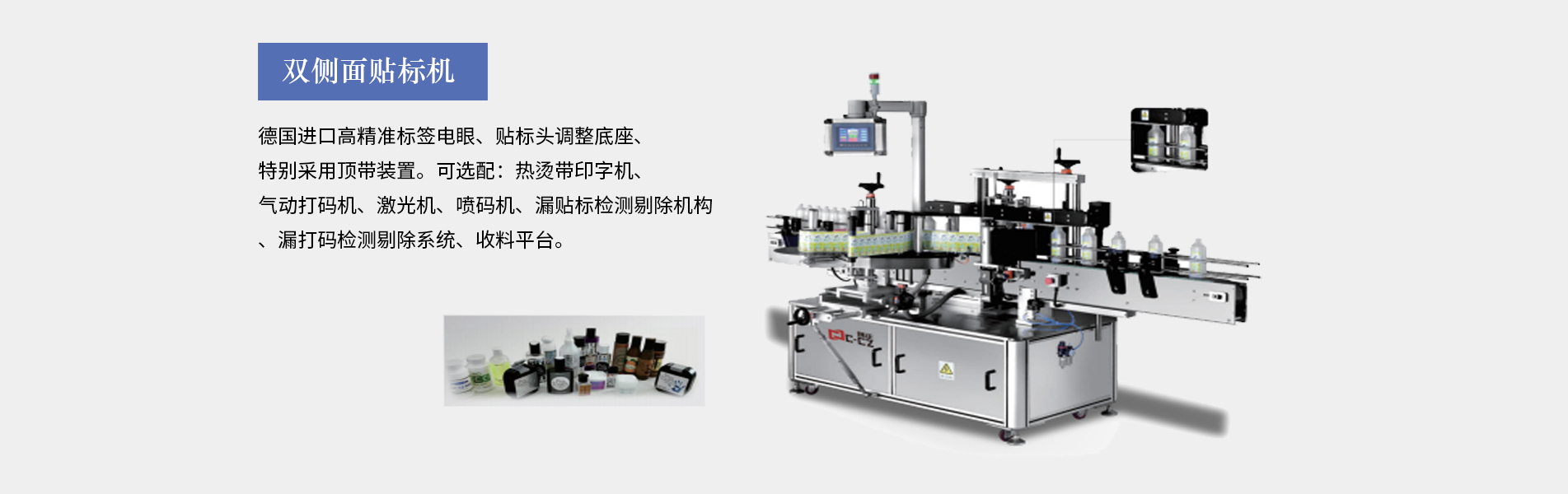 本公司生產(chǎn)的口服液貼標(biāo)機(jī)適合細(xì)長(zhǎng)形圓柱體瓶圓周表面的不干膠標(biāo)簽自動(dòng)貼標(biāo),口服液瓶等,采用彩色人機(jī)界面,離合器設(shè)計(jì),使標(biāo)簽張緊力更加穩(wěn)定,便于提高貼標(biāo)精度3、西門子PLC控制,德國(guó)、日本光眼,高精度步進(jìn),貼標(biāo)速度可達(dá)30米/分鐘,可加裝色帶打碼機(jī)、或者熱轉(zhuǎn)印機(jī)??诜嘿N標(biāo)機(jī)多為圓瓶貼標(biāo)機(jī)適用于瓶身長(zhǎng),直徑的產(chǎn)品(玻璃塑料都可以,材質(zhì)不限),同時(shí)可加工粉針劑瓶、采血管、水針劑瓶、眼藥水瓶、圓管等,專門針對(duì)...